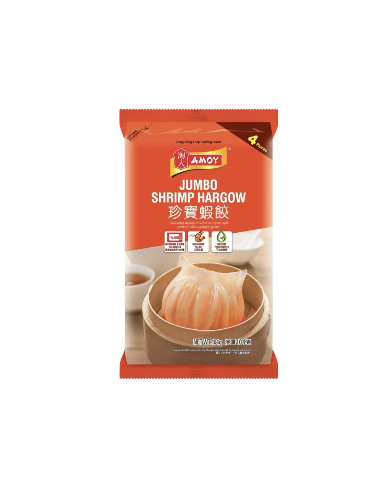 Amoy Jumbo Shrimp Har Gow 104g – Deliciously plump shrimp dumplings encased in a delicate translucent wrapper. Larger and juicier, these premium dim sum are perfect for an authentic restaurant-quality experience at home. Simply steam or microwave for a quick, satisfying treat. Ideal for dim sum enthusiasts and seafood lovers.